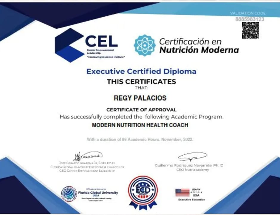 Hoy en día tiene una Certificación en Nutrición Humana Moderna avalada por la Florida Global University donde aprendió un mundo de conocimiento sobre Alimentación Keto, Ayuno Intermitente y Alimentación Carnívora.